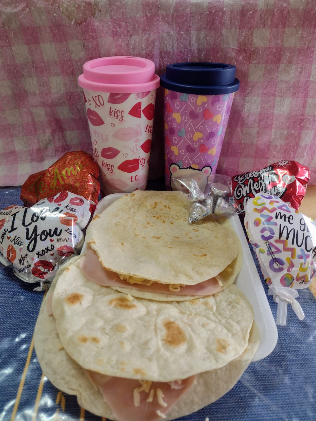 Mandale un mensaje, Globo de novios; Vaso decorativo con Café o Chcolate, Vaso de fresa o platanos con crema 2, Molletes, 2 Sincronizadas, 2 Hot Cake, Chocolate Kisses Hershys