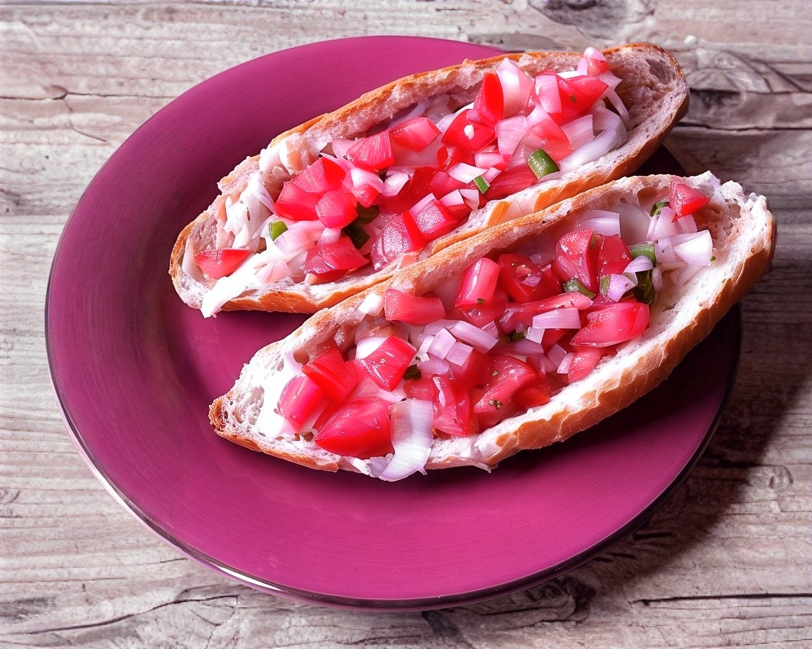 Cuernito relleno con ensalada rusa: verdura picadas, pollo, mayonesa y mostaza