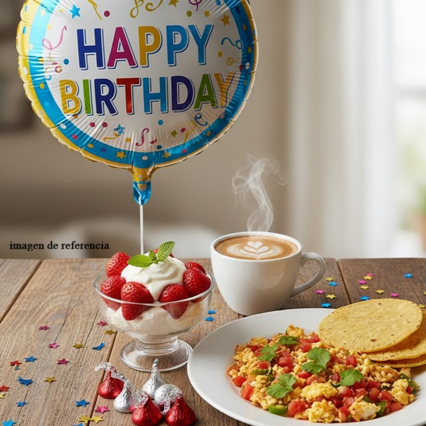Mandale un mensaje Globo de cumple; Café o Chcolate; Fresas o platanos con crema; Huevos al gusto o 2 Molletes o 2 Hot Cakes; Chocolates Kisses de Hershey, confeti