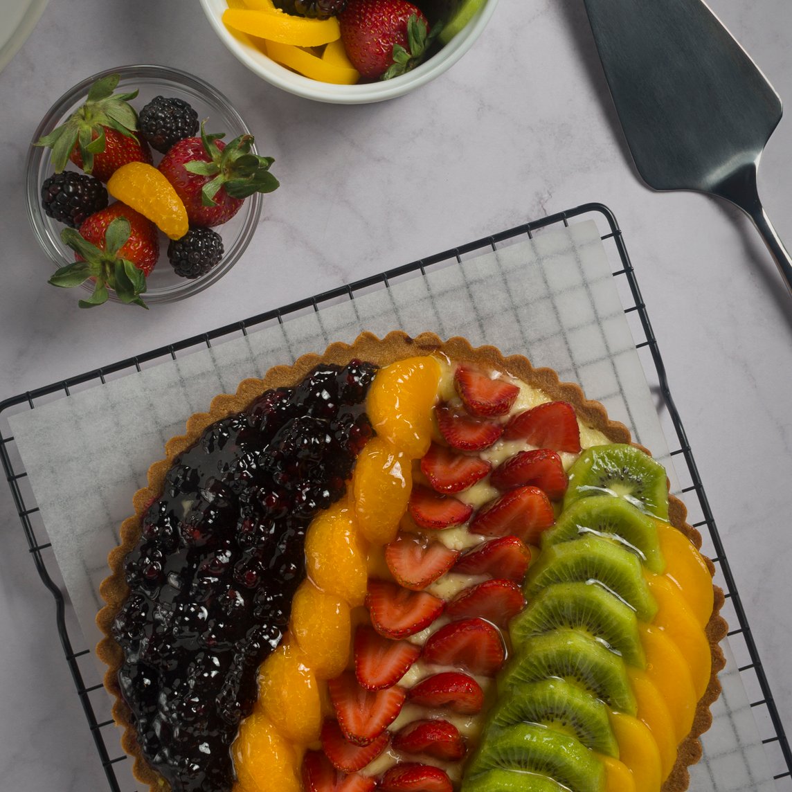 Base de galleta con nuez, capa fina de chocolate, relleno de crema pastelera y cobertura de frutas.