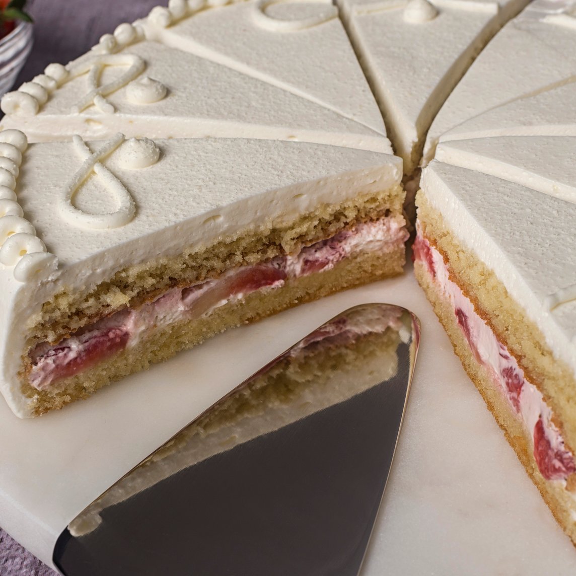 Pan de vainilla, relleno de fresas con crema, ron y cubierto de crema batida.