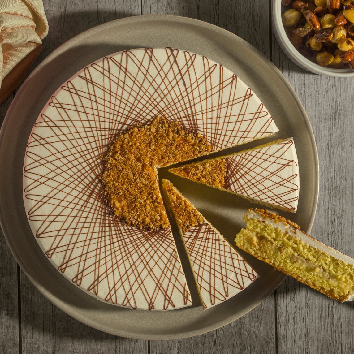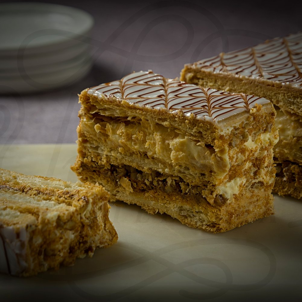 6 Rebanadas. Pastel con pasta de hojaldre, relleno de crema pastelera y nuez.