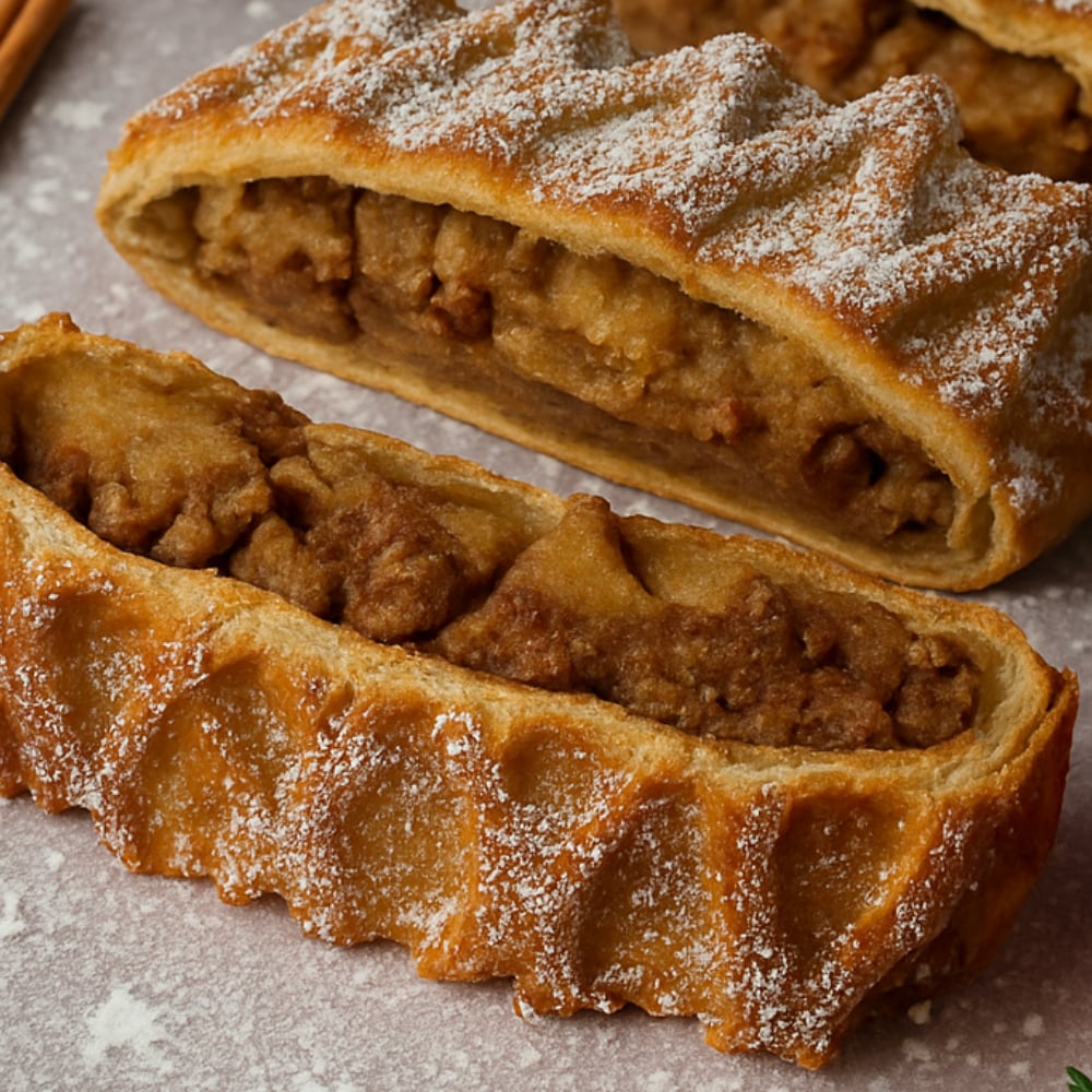 6 Rebanadas. Pasta hojaldre, relleno de manzana con canela y nuez.