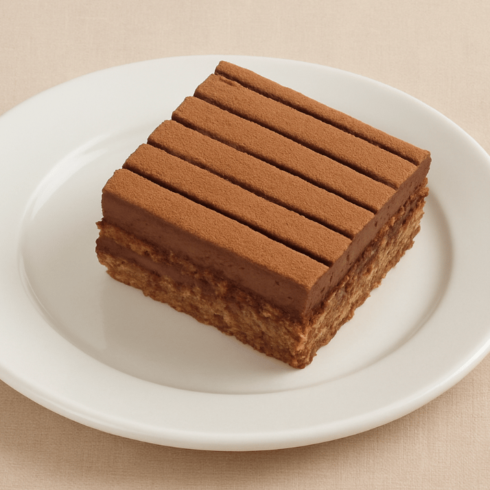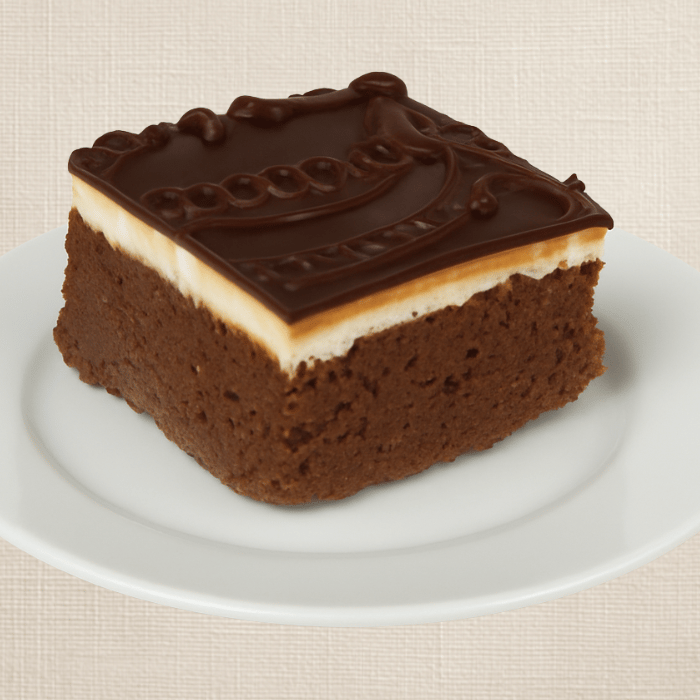 Pan de nuez con crema de trufa, cocoa, chocolate semi amargo y ron. Cuadrado.