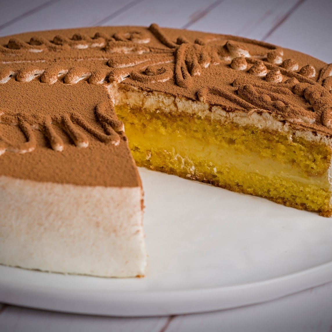 Pan de chocolate, pan de vainilla, relleno de crema de moka y nuez con licor de café.