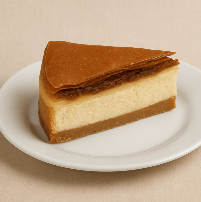 Rebanada de pastel a base de galleta, queso con pasta árabe y nuez.