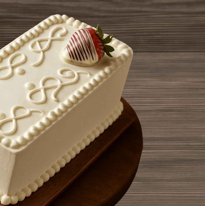 Pan de vainilla, relleno de fresas con crema, y cubierto de crema.