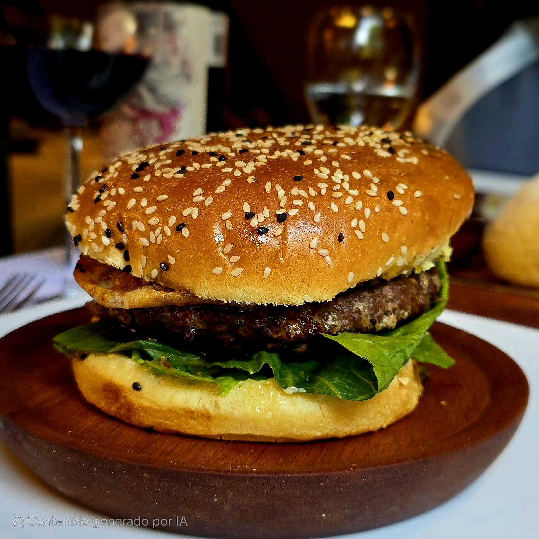 Hamburguesa Certified Angus Beef® de 8oz a la parrilla, con lechuga italiana, jitomate, provolone ahumado, servida en pan de ajonjolí y ajonjolí negro con chimichurri. Con papas fritas.