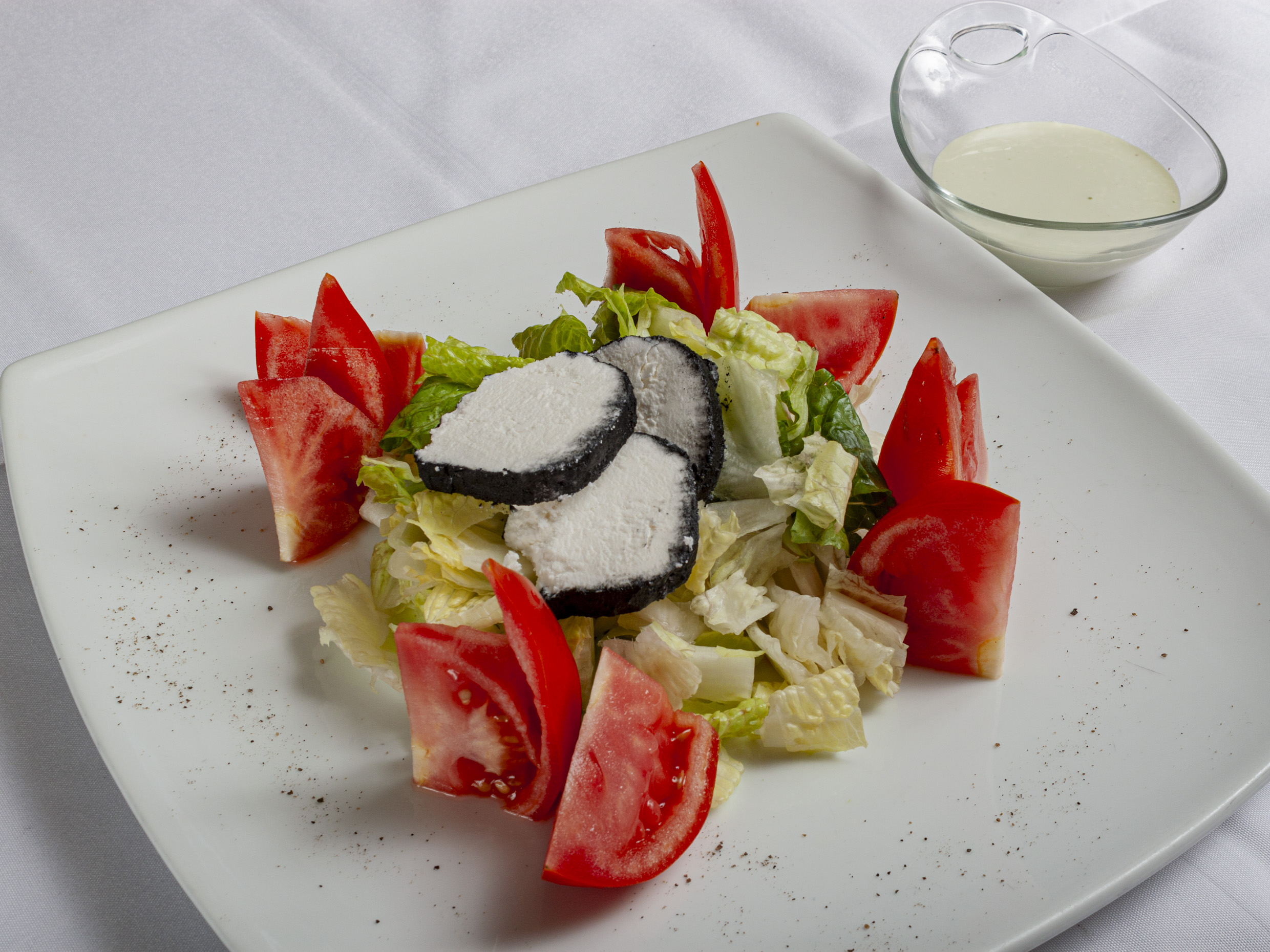 Lechuga con jitomate, cebolla y queso de cabra con aderezo aurora.