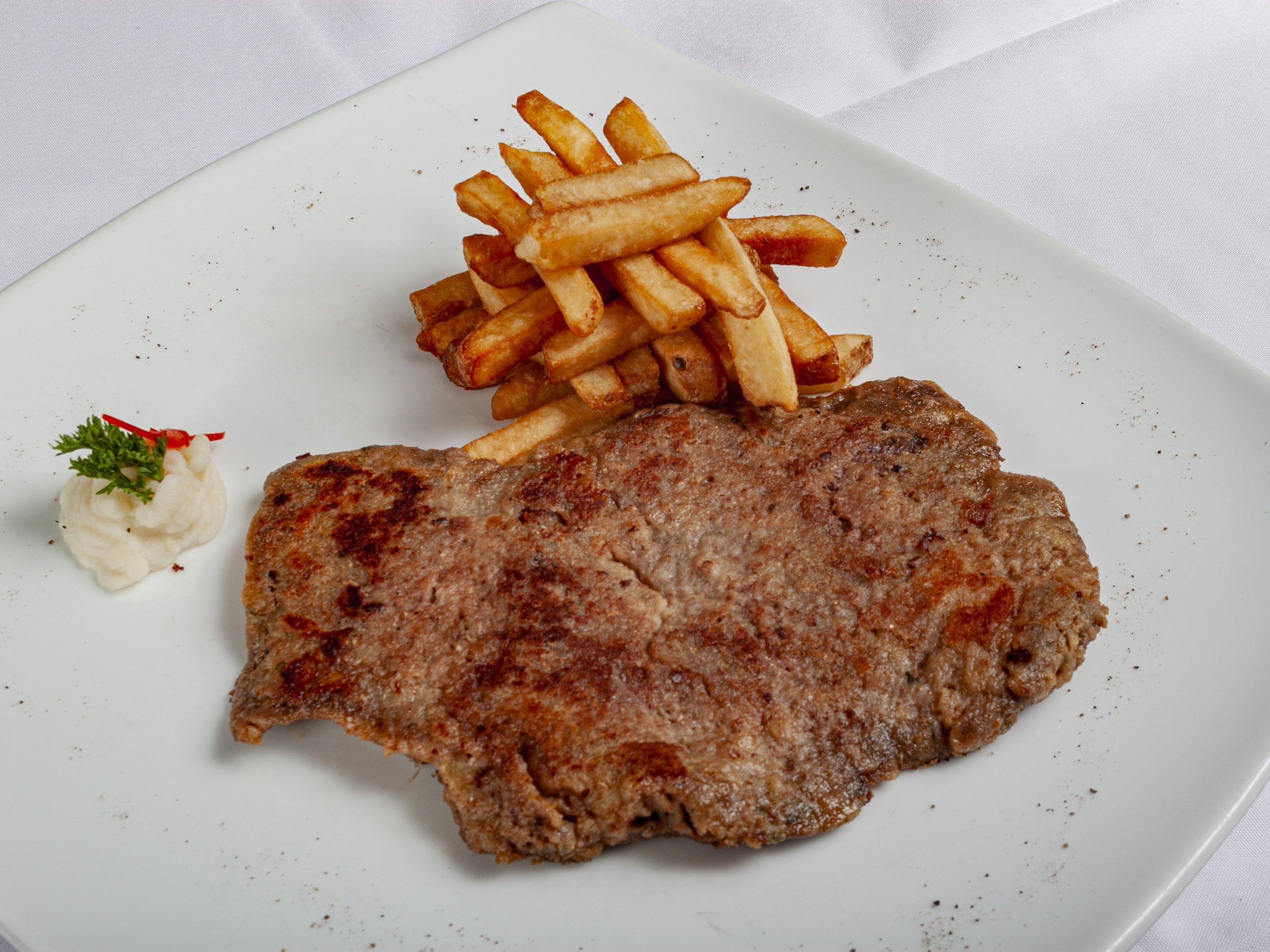 200g de filete de lomo, bañado en salsa de tomate, jamón y queso y 100g de papas a la francesa.
