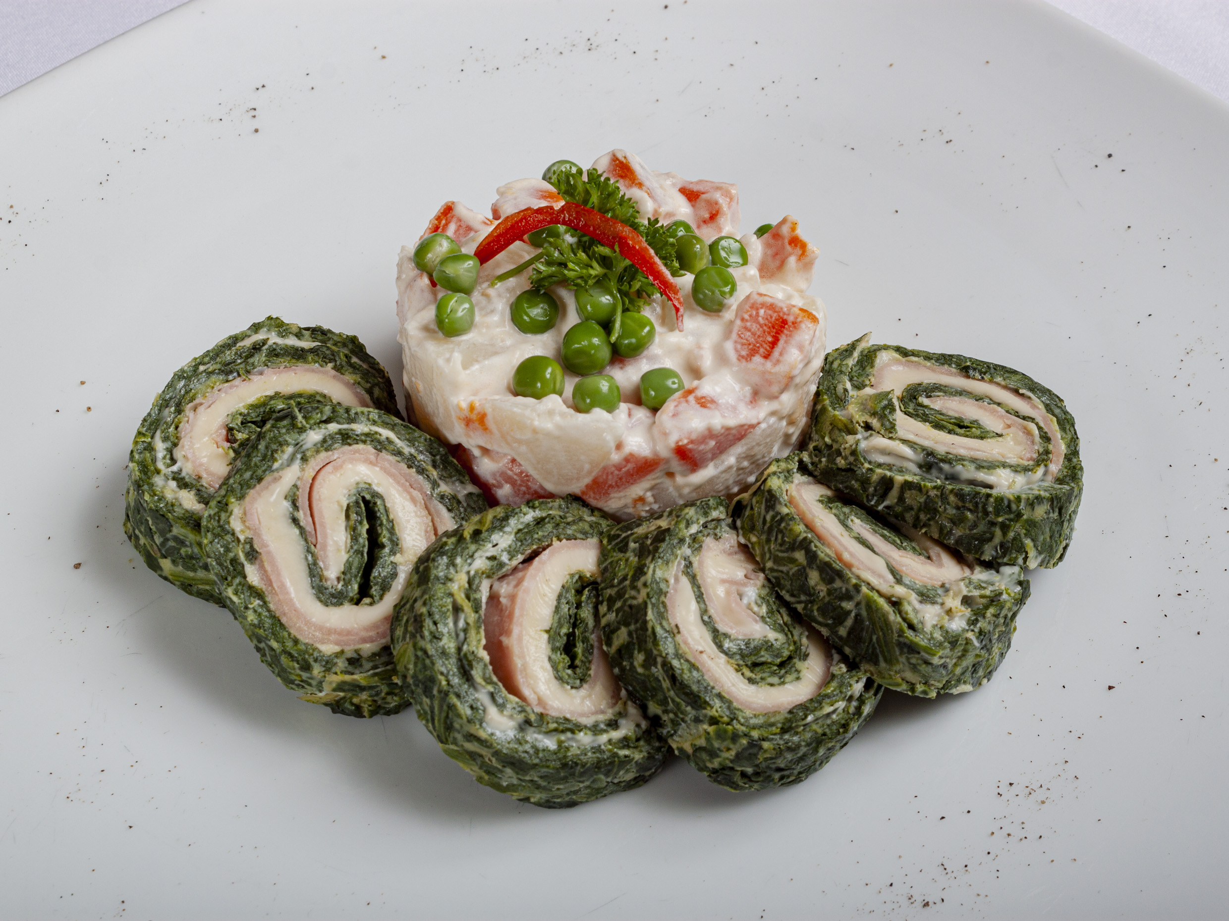 5 rebanadas de 40g con jamón, queso, pimiento, aceituna verde, mayonesa y huevo. Incluye ensalada waldorf como guarnición.