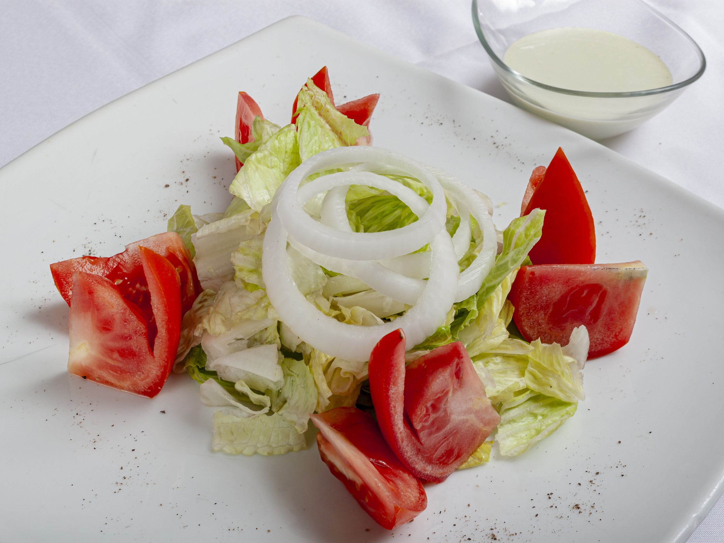 Lechuga con jitomate y cebolla con aderezo aurora.