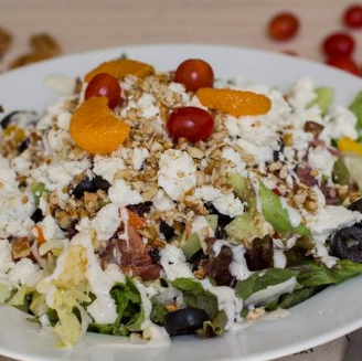 Combinación de 3 lechugas, espinaca, pimiento rojo, amarillo o anaranjado (según temporada), jitomate cherry y pepino, vinagre balsámico de módena y aceite de oliva. Lo anterior topado con generosa porción de jamón de pavo, queso de cabra y un toque de conserva de mandarina, nuez y arándano.