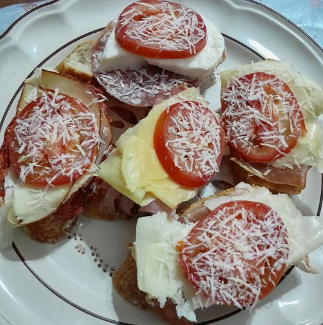 Dos torres de jitomate, queso mozzarella, aceite de oliva, un toque de vinagre balsámico de módena. Aderezada con un toquecito de pesto de albahaca. Se sirve con rodajas de pan para “limpiar el plato”.