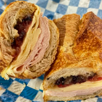 Pechuga de pavo ahumada, queso mozzarella, queso gruyere y un toque de mermelada de pétalos de rosa.