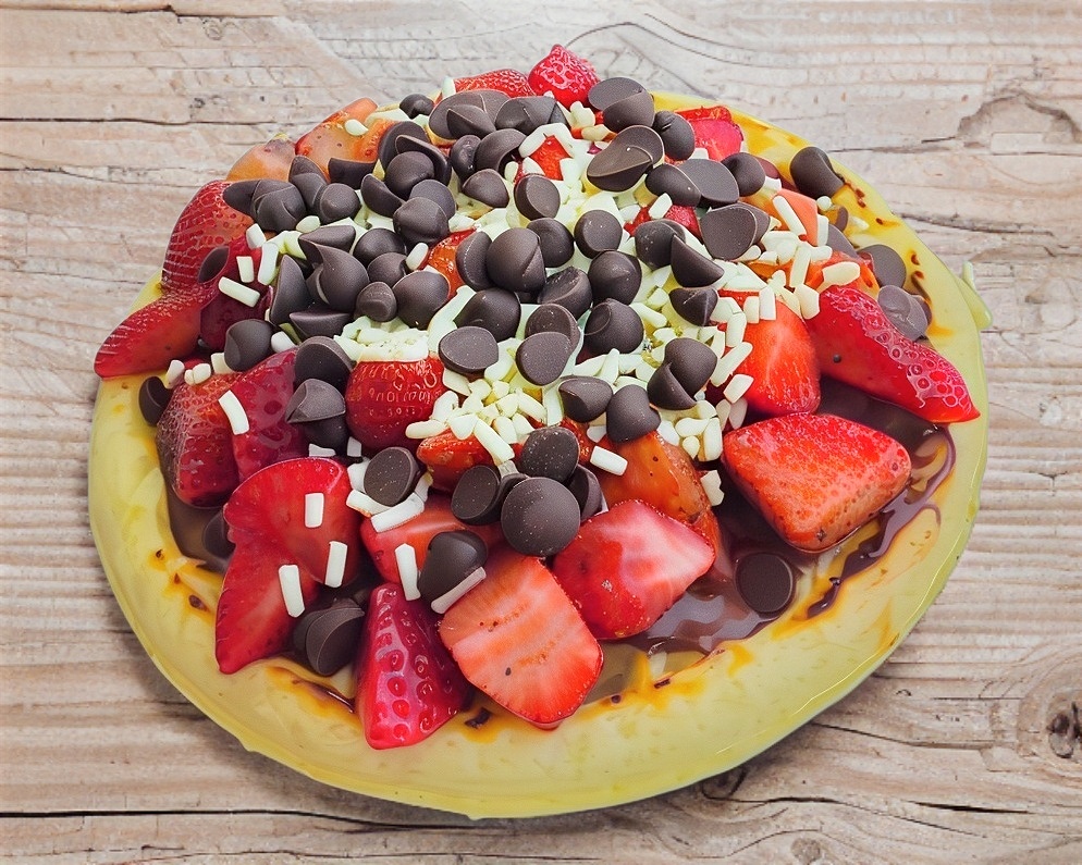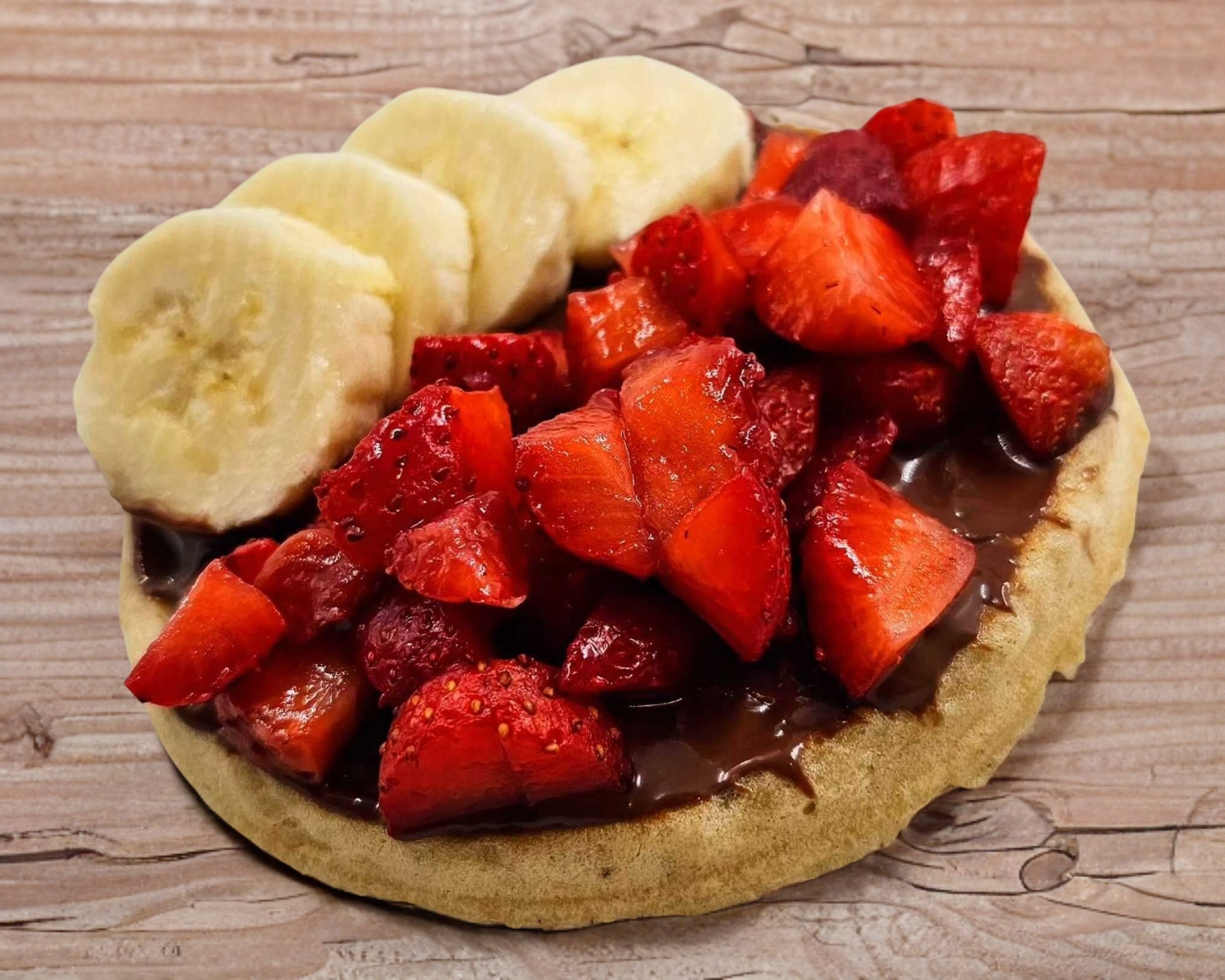 Waffle calientito, base mermelada con plátano fresco y fresas jugosas, espiral de nutella y gotas de chocolate amargo. Llévate 3 piezas en promo al 50%