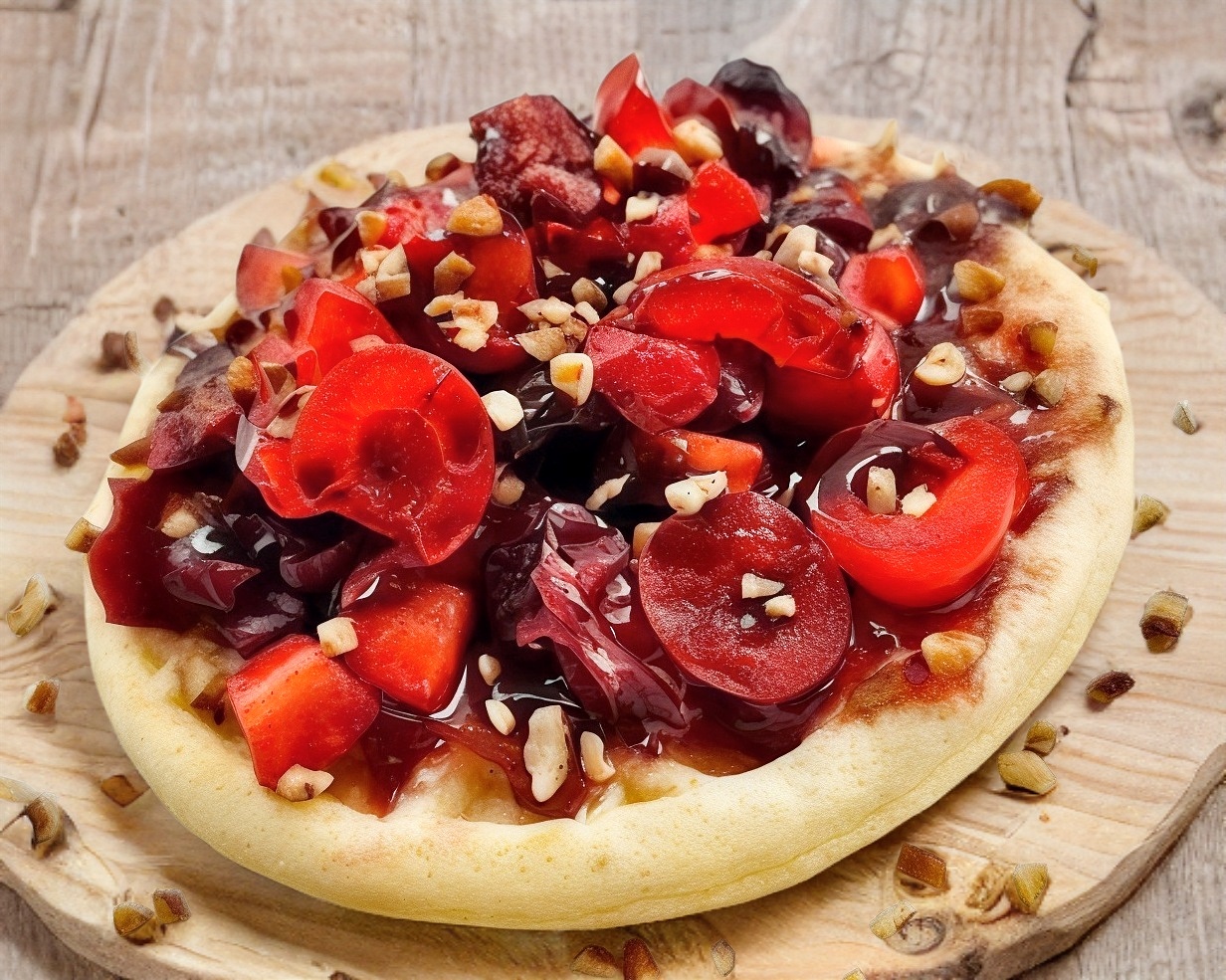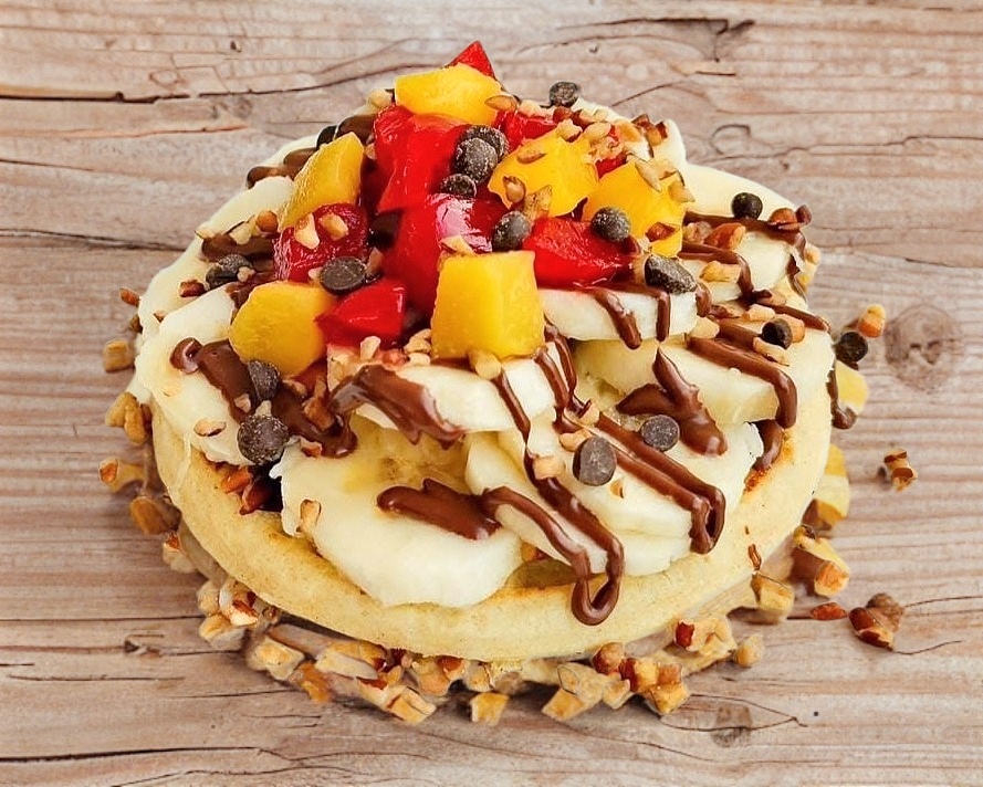Waffle calientito, base nutella con durazno, cerezas, plátano y mix de nuez con gotas de chocolate. Llévate 3 piezas en promo al 50%