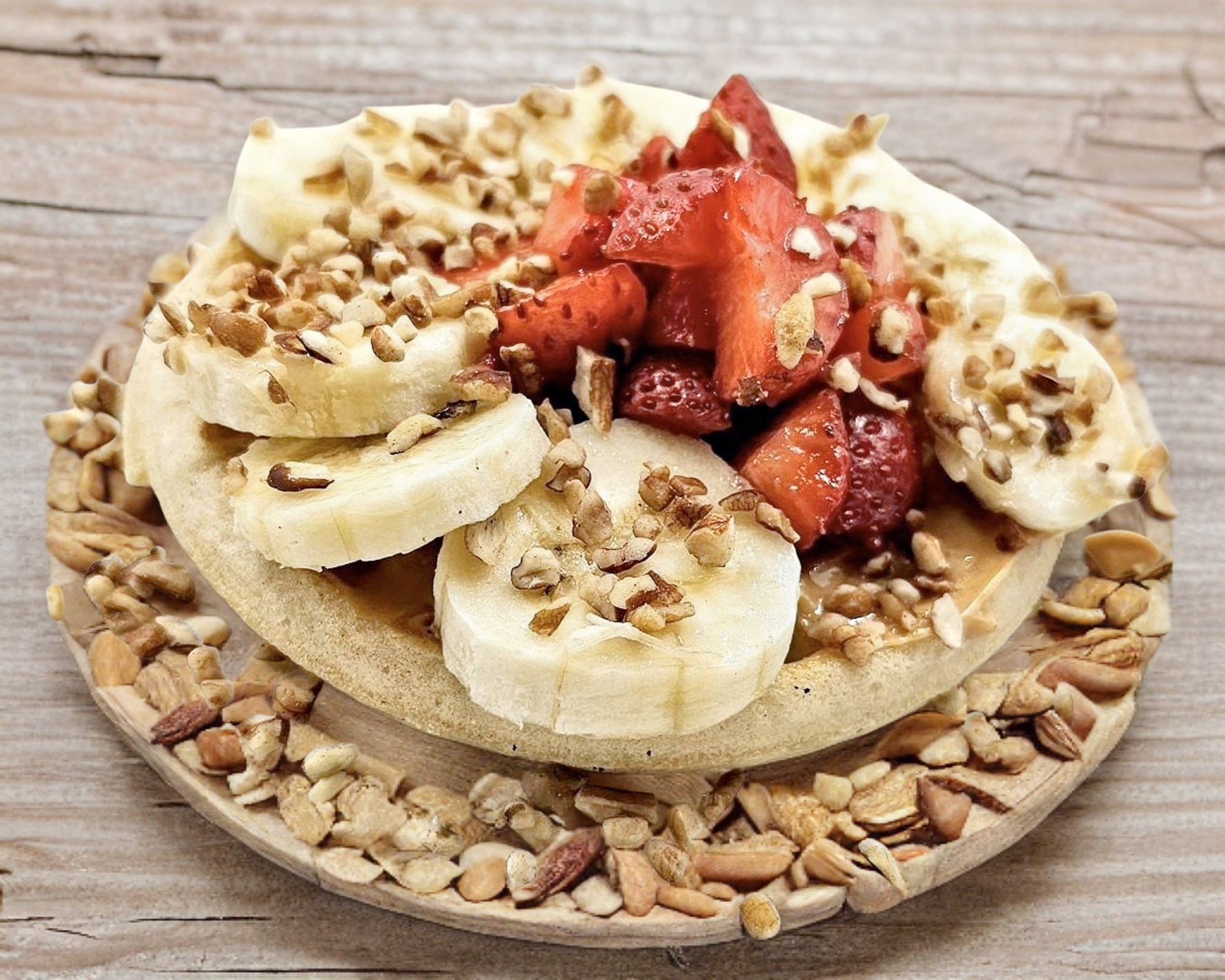 Waffle calientito, base crema de cacahuate con fresas jugosas y plátano fresco con nuez. Llévate 3 piezas en promo al 50%