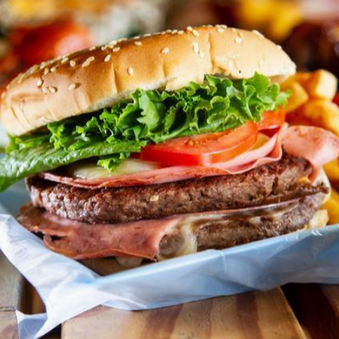 160 gramos de carne, 2 rebanadas de jamón, tocino, cebolla asada, jalapeños, doble queso y champiñones.