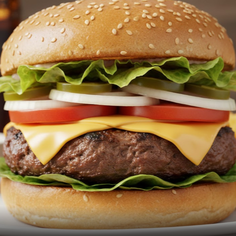 150 gramos de carne, jitomate, cebolla, lechuga, jalapeños y queso amarillo.