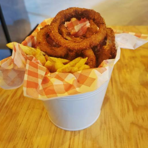 Orden de aros de cebolla acompañado de papas a la francesa y aderezos.