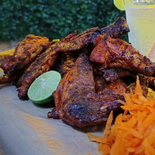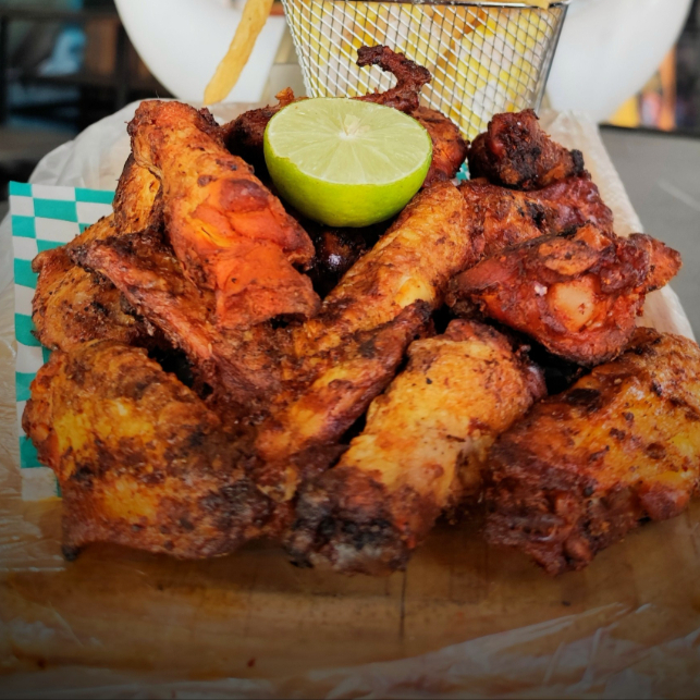 Alitas al carbón 5 piezas, acompañado de vegetales y salsa artesanal a elegir.