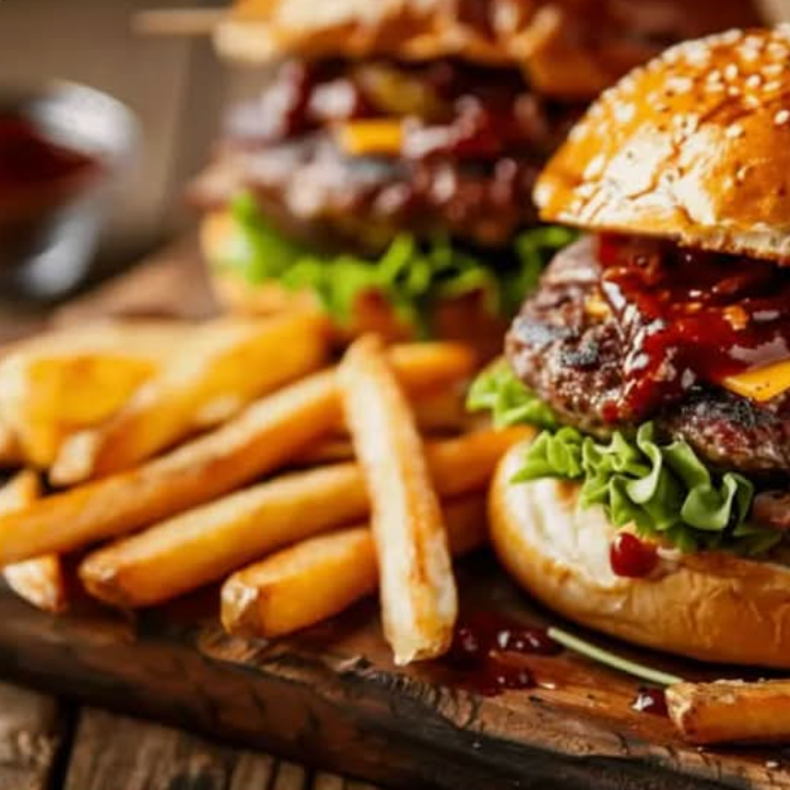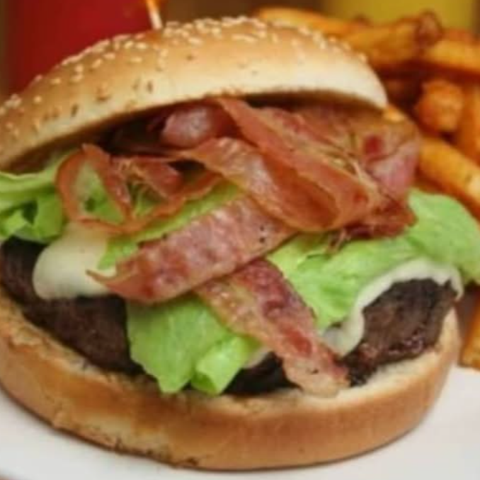 Doble carne,tocino,salsa bbq y papas a la francesa.imagen de referencia.