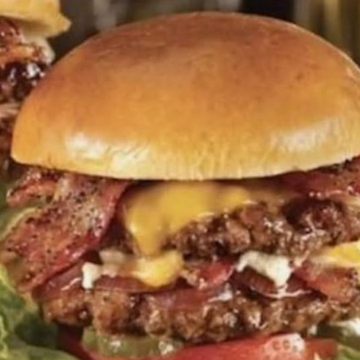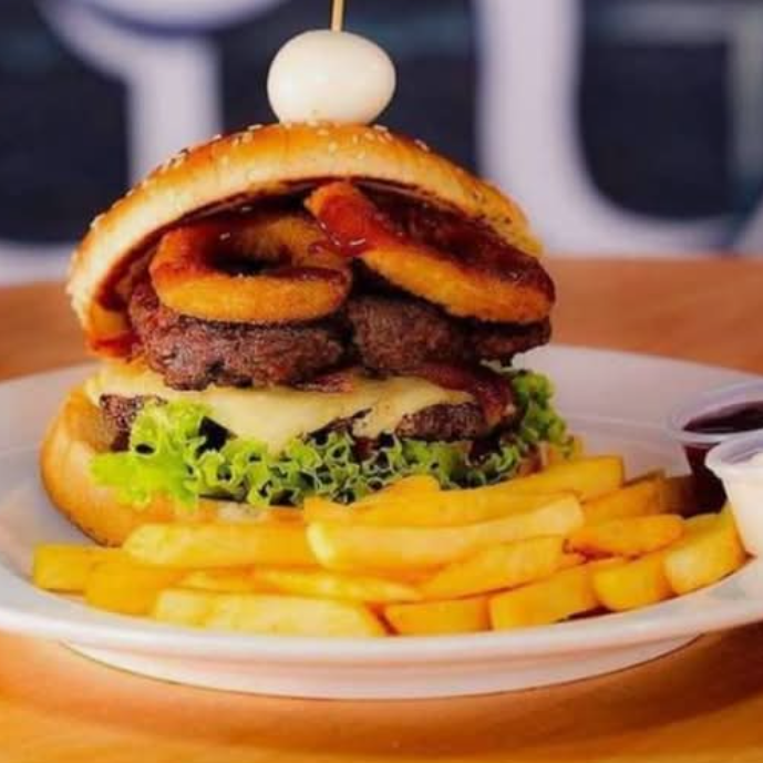 Doble carne , aros de cebolla,queso amarillo y papas a la francesa.imagen de referencia