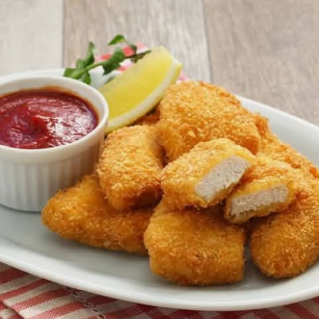 6 pza de nugget de pechugita acompañados de catsup, salsa valentina y queso amarillo liquido. IMAGEN DE REFERENCIA