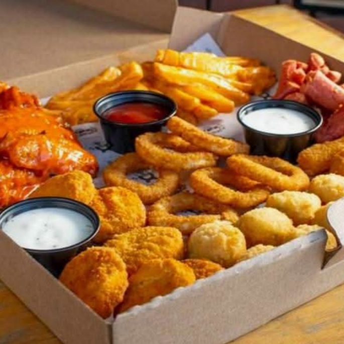 Lleva un poquito de todo , de nuestra barra de snacks como son:palomitas de pollo,papas de gajo,nuggets de pollo,papas a la francesa. IMAGEN DE REFERENCIA
