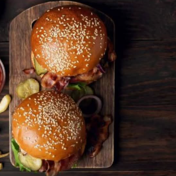 Consiste en 2 hamburguesas clasicas que llevan: super bimbollo, 1 Carne 100% de res,queso amarillo, catsup,mayonesa y mostaza la imagen es solo de referencia.