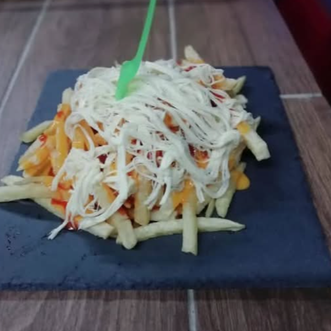 Papas a la francesa con trocitos de todo, jamón, queso oaxaca, salchicha, piña. imagen de referencia.