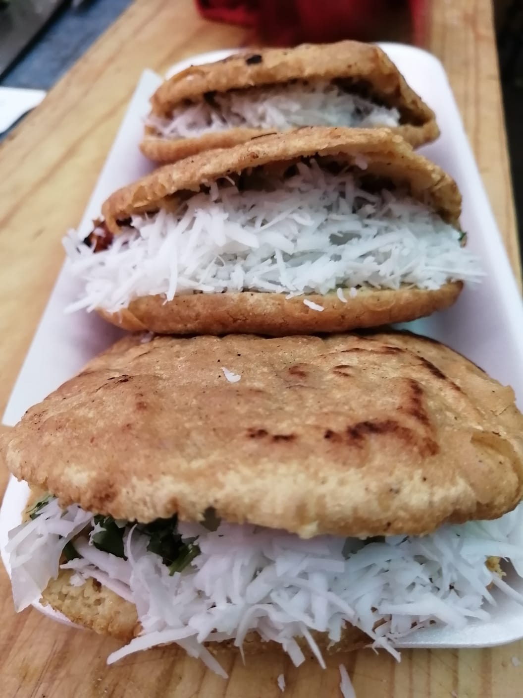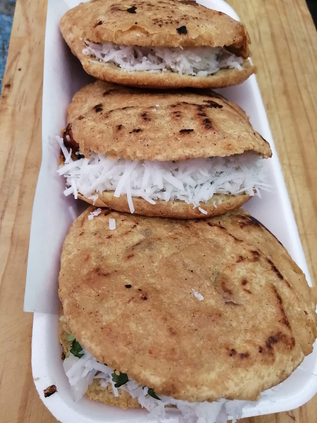 Escoge si son fritas o a la plancha. Se acompañan de queso rallado y crema. La salsa va aparte.