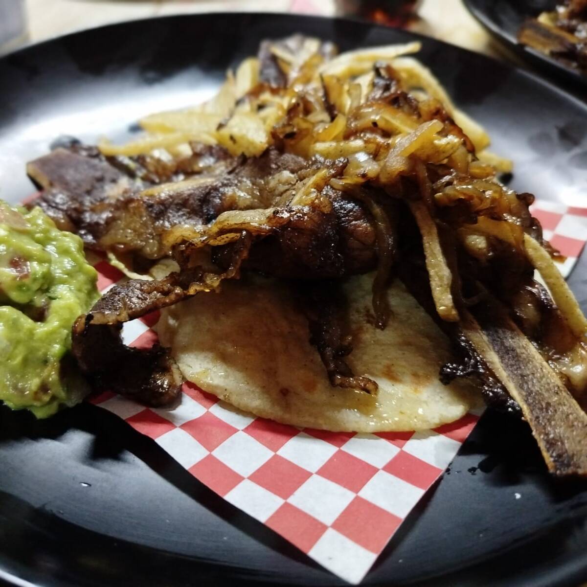 Aguja norteña, sazonada y asada con todo el toque callejero que nos encanta. Se acompaña de papas y cebolla frita.
