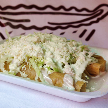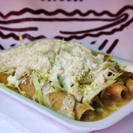 Tacos Dorados de Pollo Ahogados en Salsa Verde