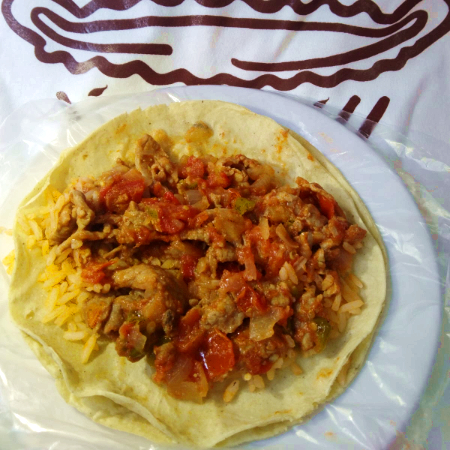 200 gr, Longaniza con papas, cebolla y chile cuaresmeño con cama de arroz.