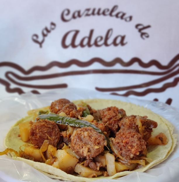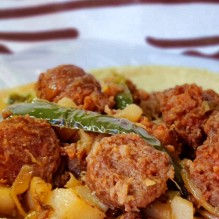 Longaniza con papas, cebolla y chile cuaresmeño. c/Tortillas.