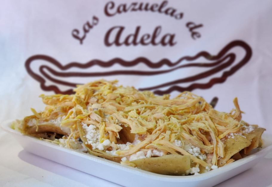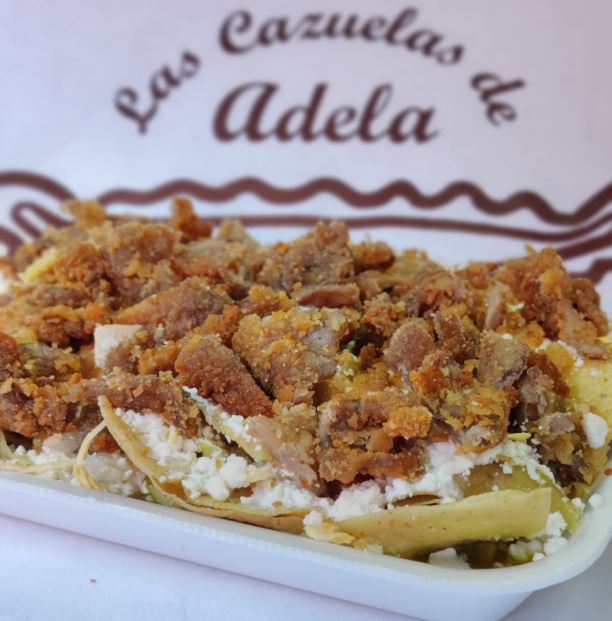 450 gr de totopos a base de harina de maiz bañados en salsa verde. Queso rallado , crema, cebolla, milanesa de res (45 gramos)