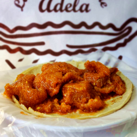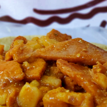Chicharrón de Cerdo en salsa roja de chile de árbol. c/Tortillas.