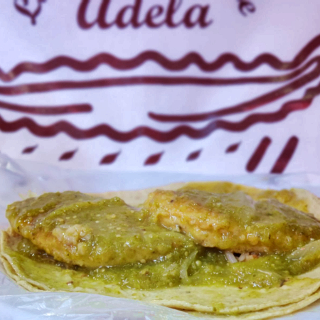 Tacos de pollo en salsa verde con Queso, Crema, Cebolla y Lechuga.