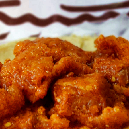 200 gr, chicharrón de cerdo en salsa roja de chile de árbol con cama de arroz.