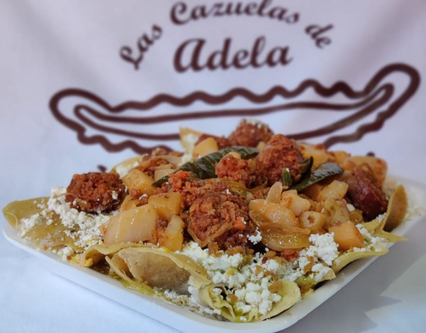450 gr de totopos bañados en salsa verde. Queso, crema, cebolla, longaniza con papas.