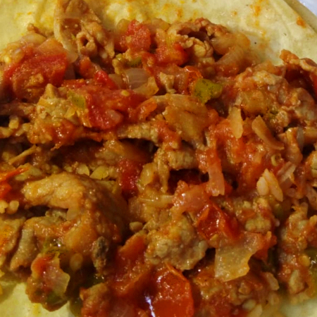Bistec de res con chile serrano, cebolla y jitomate. c/Tortillas.