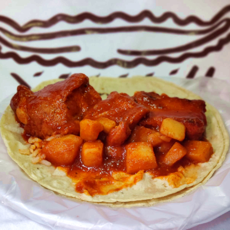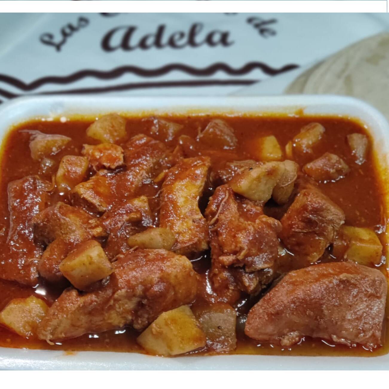 Carne de cerdo en salsa de chile guajillo con papas. c/Tortillas.