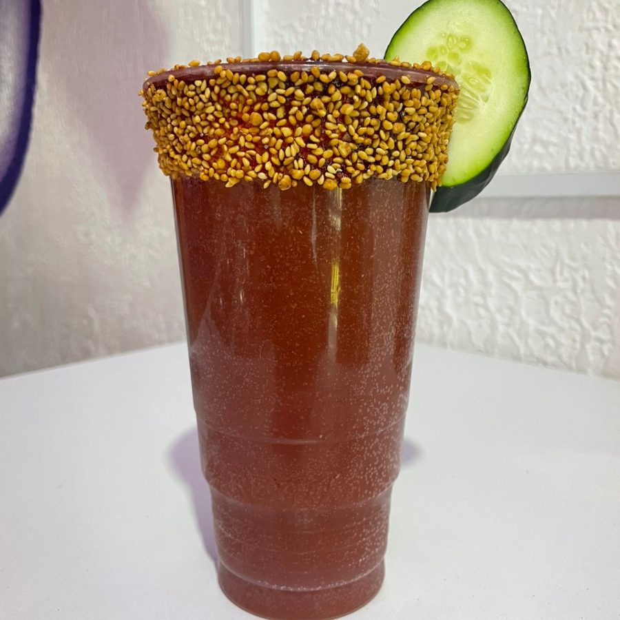 Hielo, clamato, limon, sal, pimienta, salsas negras.