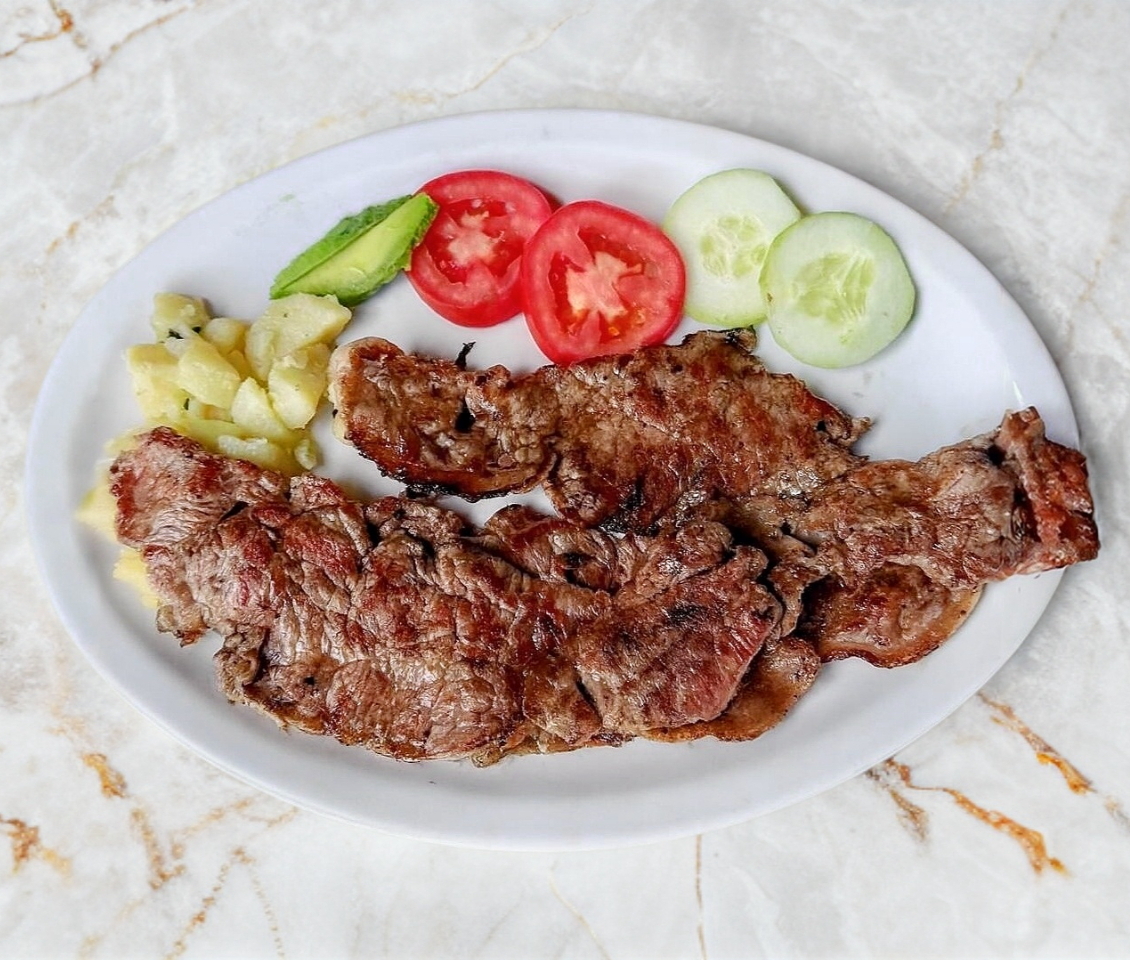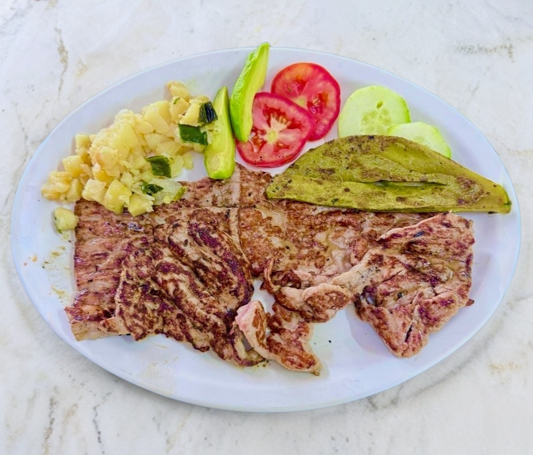 300 g de arrachera suave y jugosa, servida con frijoles de la olla, tortillas, papas tradicionales de la casa, guarnición fresca de pepino, jitomate y nopal asado, más nuestra salsa de jitomate tatemado.