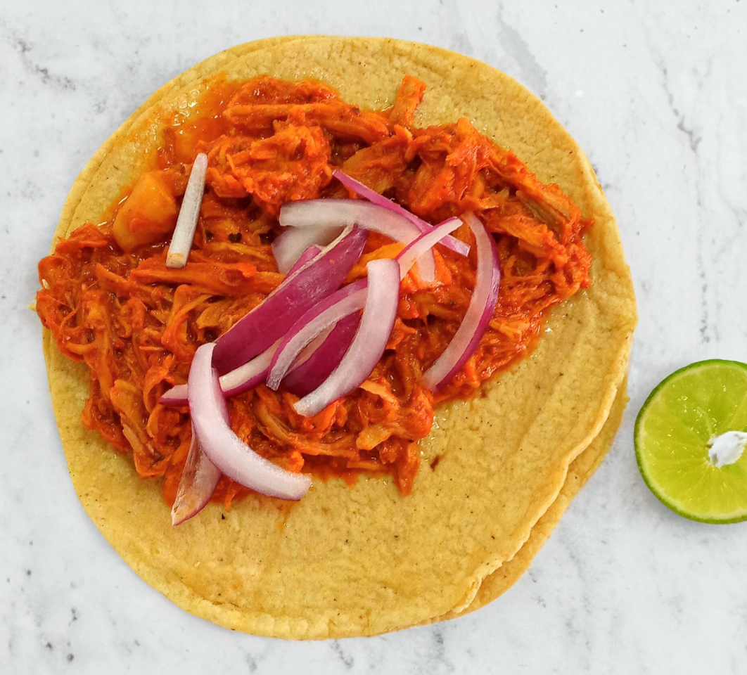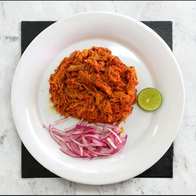 350 g de cochinita pibil preparada con achiote traído desde Yucatán. Servida con cebolla morada al estilo yucateco, frijoles refritos, tortillas y salsa de habanero.