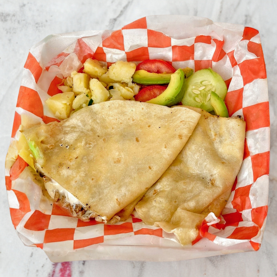 Mega Quesadilla con pechuga de pollo a la parrilla y queso Oaxaca fundido, servida con papas tradicionales de la casa, guarnición fresca de pepino, jitomate y nopal asado, más nuestra salsa de jitomate tatemado.