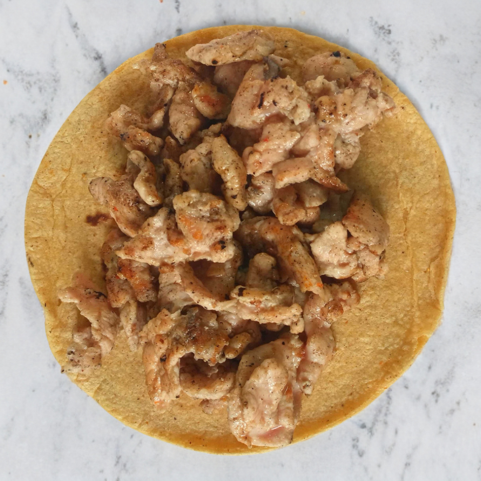 Taco de cochinita pibil (90 g), preparado con achiote tradicional. Incluye cebolla morada encurtida para un contraste auténtico.
