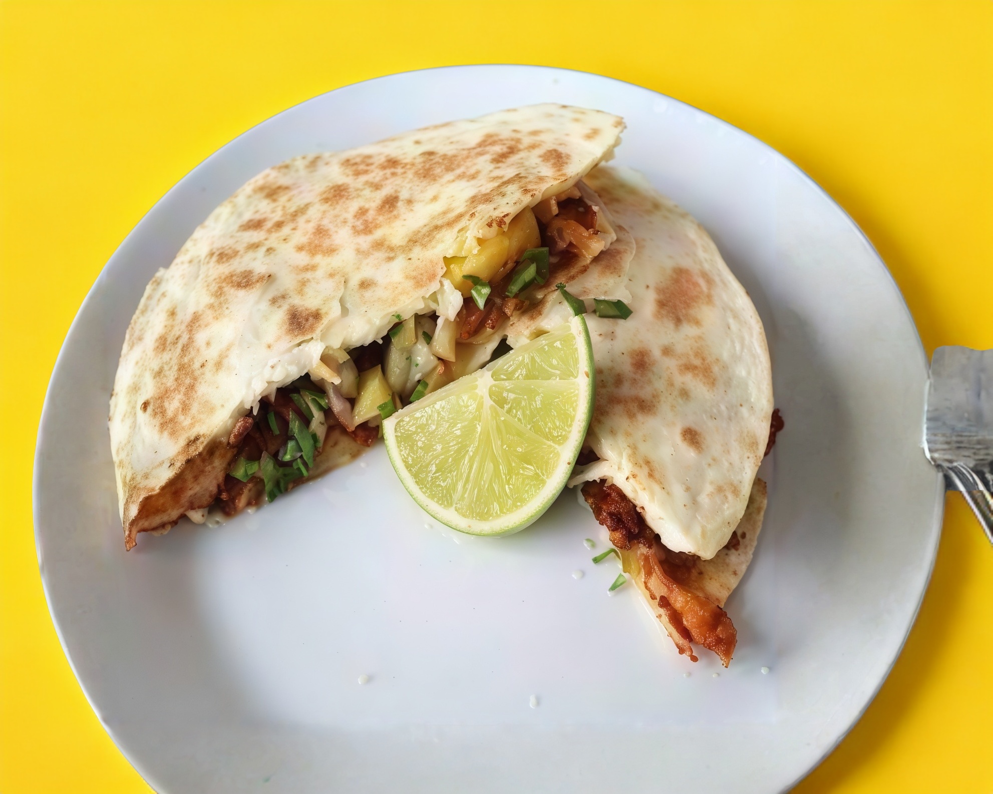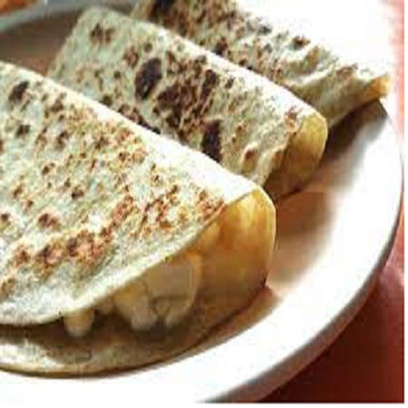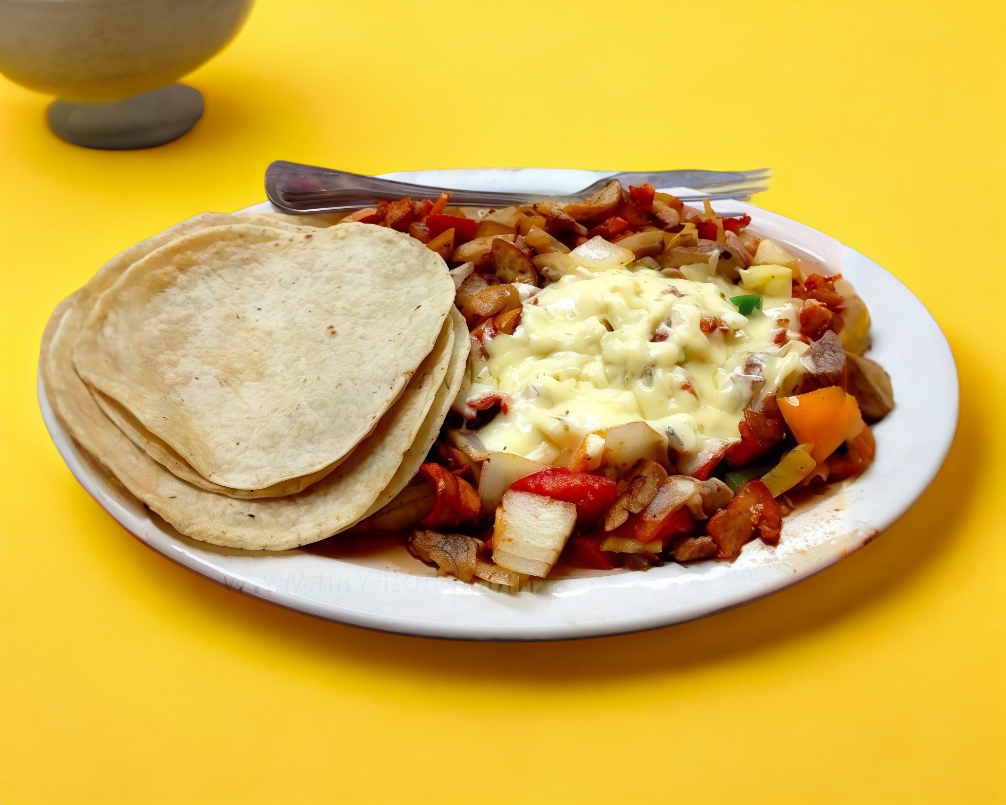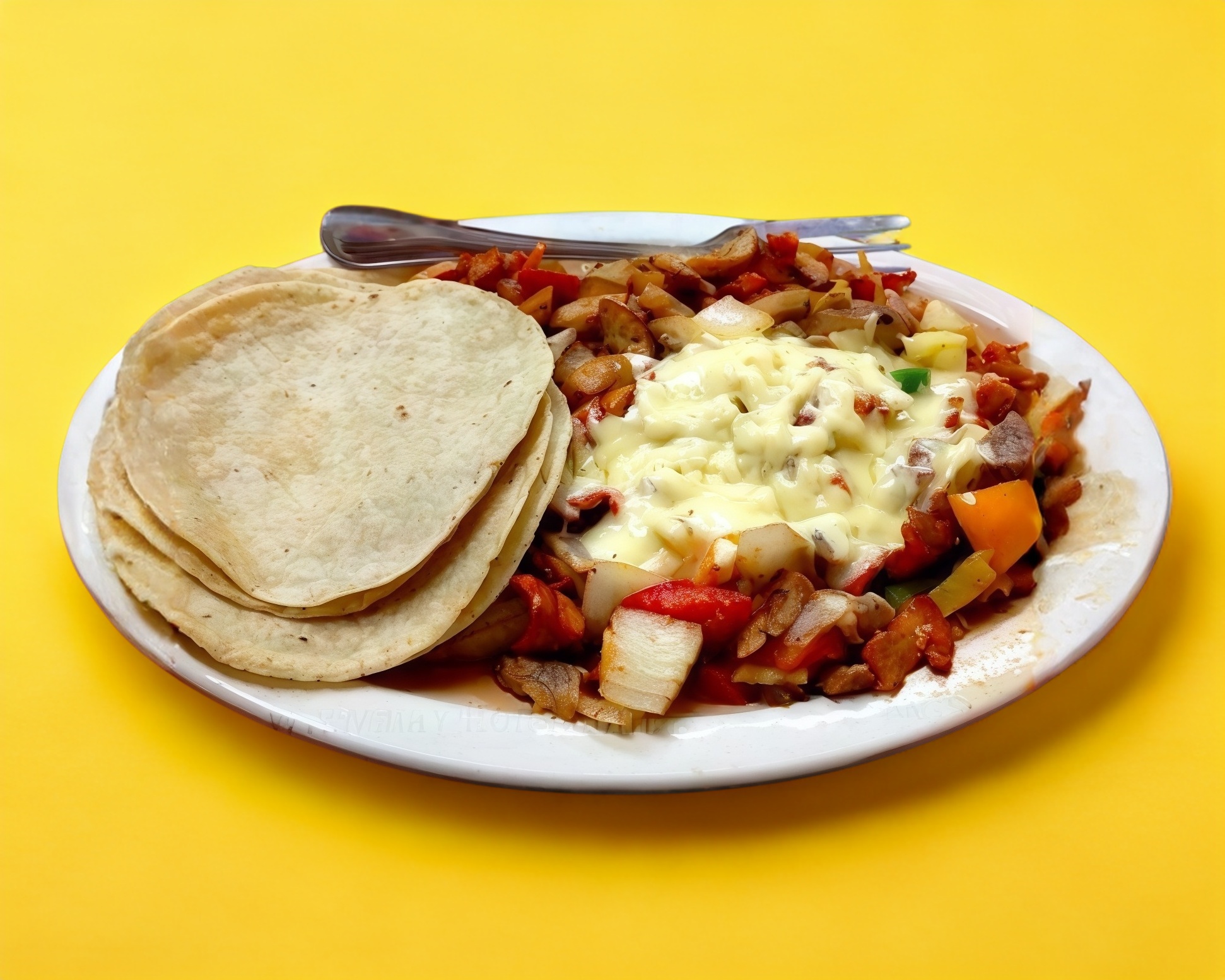 Queso dorado con bistec cilantro y cebolla sobre 2 tortillas de harina